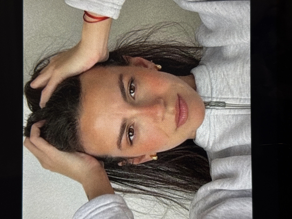 A headshot-style image features a young adult female centered within the frame. She has dark hair, styled with volume and appears to be held or pushed upwards by her hands, which are positioned on either side of her head. Her face is towards the viewer, with brown eyes directed forward. Her cheeks and nose exhibit a flush or blush. She wears small, gold-toned hoop earrings. A light grey, long-sleeved garment with a front zipper is visible on her torso; the zipper pull is silver-toned. A red string is wrapped around her right wrist. The background is a plain, light grey or off-white wall with a subtle texture. The image itself appears to be framed within a larger digital display or screen, indicated by uniform black bars at the top and bottom edges. The image provides no discernible information regarding its location in Palma de Mallorca, Spain, or any specific geographic setting.