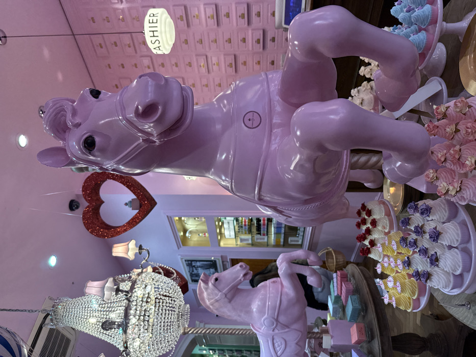 This image depicts the interior of Crumbs Cupcakery, located on College Street, York, United Kingdom. The scene is characterized by a vibrant, predominantly pink color scheme under bright artificial illumination from recessed ceiling lights and two ornate crystal chandeliers. In the foreground, a large, glossy light pink carousel horse statue is prominently positioned, appearing to gallop with its front legs raised. A circular "Crumbs Cupcakery" logo with a crown icon is affixed to its side. A second, smaller, similar pink carousel horse statue is situated to the left and slightly behind the primary horse. Below these statues, multiple wooden tables display tiered arrangements of cupcakes on white and light pink stands. Varieties include cupcakes topped with yellow daisy decorations, purple flowers, red roses, and clusters of light pink rosettes. Additionally, light blue frosted cupcakes are visible on a separate stand. On a table to the left, various rectangular, pastel-colored items, possibly soaps or packaged goods, are neatly arranged, alongside a small woven basket. The ceiling features a large, glittery red heart-shaped ornament hanging in the mid-ground, within which a miniature white cake or decorative item is visible. A small security camera is mounted on the ceiling nearby. The right wall is textured with a grid of rectangular pink panels and features a vertically-oriented, illuminated white sign displaying the word "CASHIER" in black capital letters. In the background, a glass display cabinet with internal lighting showcases numerous small bottles or items. One individual is partially visible in the mid-ground, obscured from the waist up by the smaller pink horse. They are wearing dark upper clothing and light-colored trousers, standing within the retail space.