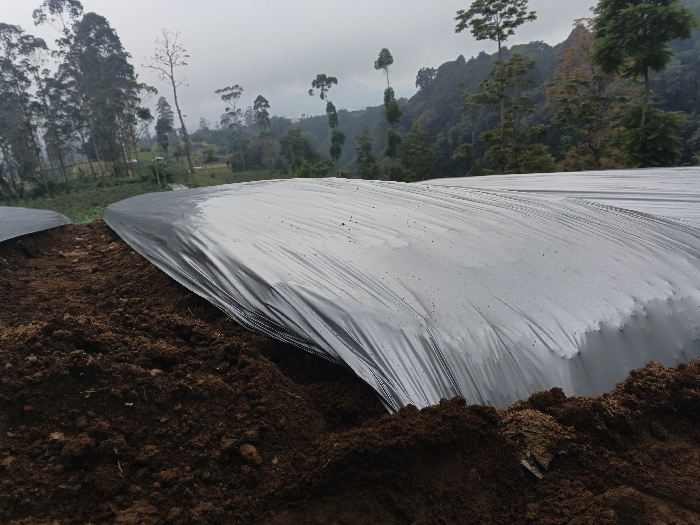 The image displays an agricultural field in Khna, Cambodia, under an overcast sky. In the foreground, dark brown, tilled soil occupies the lower portion of the frame, showing loose texture and small clods. Elevated soil beds are partially covered with a black and silver plastic mulch film. The silver, reflective side of the film faces upwards, exhibiting numerous wrinkles and folds from its application. The black underside of the mulch is visible at the edges and where the film is secured into the soil. Additional mulched beds extend into the midground. The background features a dense line of tall trees, followed by a vegetated mountainous or hilly terrain. No individuals are present, nor are any specific actions depicted.