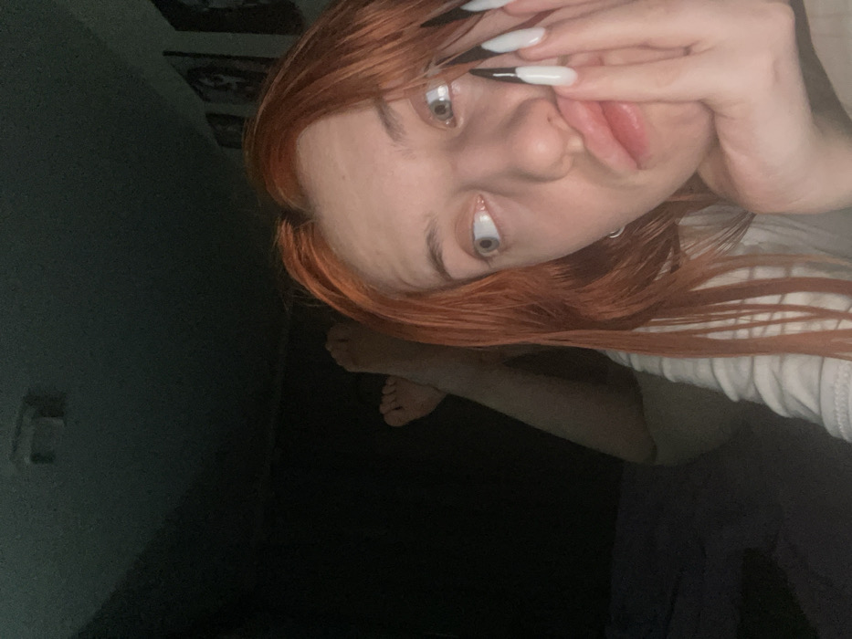 An individual with long, reddish-orange hair is depicted lying prone indoors within a low-light residential setting, consistent with a location in Engels, Russia. The person's head is propped by their right hand, which features long, pointed artificial nails with white and black tips. Their light-colored eyes are directed towards the left side of the frame, and their lips are slightly pursed. A small silver hoop earring is visible in their left ear. In the upper left background, the individual's bare feet are visible, crossed at the ankles. The background is largely dark, with a faint ceiling fixture discernible in the upper center and indistinct framed items on the wall to the right. The person is wearing a light-colored top.