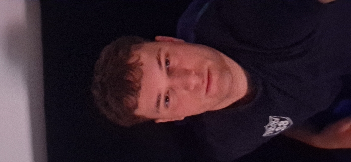 The image displays an adult male facing forward, looking directly into the camera. He has short, curly brown hair with bangs and a neutral facial expression. The individual is wearing a dark t-shirt with a white emblem, resembling a shield, on the left chest. The background is largely dark and out of focus, with a faint, lighter horizontal band visible at the top edge of the frame. The scene is located in the city of Pancharevo, Bulgaria.