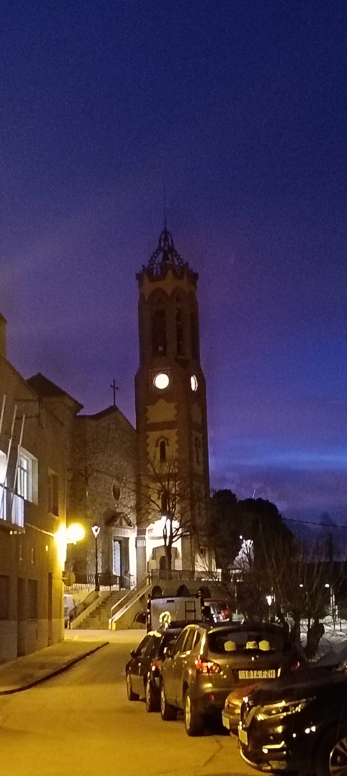 A church tower with clock faces is illuminated at night, standing beside a stone church with a cross on top. Cars are parked along a street leading towards the church. Streetlights cast a warm glow. The sky is a mix of dark blue and purple hues, suggesting twilight. Bare trees and hints of landscape are visible in the background.