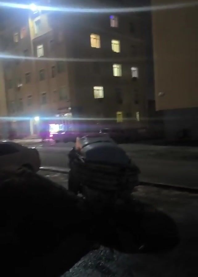 n urban nighttime scene. Tall buildings with illuminated windows are in the background. Cars are parked along the street. Piles of dark material, possibly dirt or debris, are in the foreground. The camera moves slightly, eventually focusing on two men walking under a covered walkway. Light flares from streetlights or building lights are visible throughout the video. The overall scene is somewhat dark and blurred.