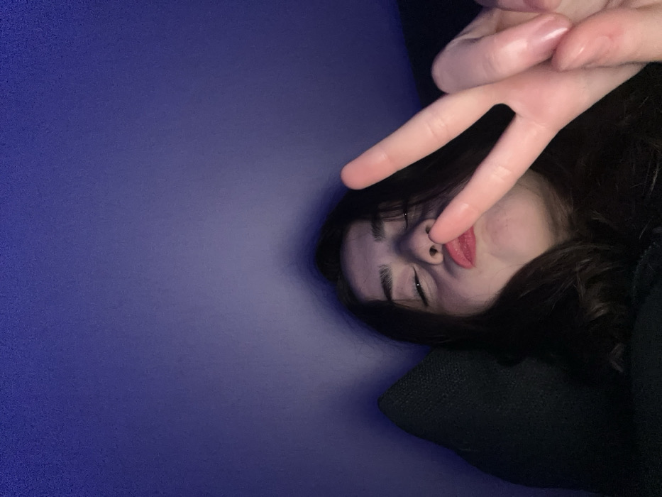 The image presents a close-up, low-light indoor portrait of a single individual, identified as a young female, in Strasbourg, France. The subject's head and upper torso are visible, positioned against a dark, possibly cushioned surface on the left side of the frame. She possesses dark hair, with her eyes closed or heavily squinted. Her mouth is puckered in an expressive gesture, coated with red lipstick. Her left hand is raised, oriented towards the camera, displaying a "peace" sign with the index and middle fingers extended. The background consists of a plain, gradient wall, transitioning from a darker blue-purple at the top to a lighter hue towards the bottom, consistent with an interior setting. No other subjects, specific objects, or environmental details are discernible that would indicate the precise room or its contents.
