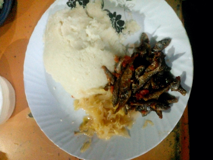 A white plate holds a portion of a starchy, white food, possibly ugali or mashed potatoes, dominating the left side. Adjacent to it are small fried fish, perhaps sardines or anchovies, cooked with a red sauce. A smaller amount of shredded, yellowish cabbage or sauerkraut is positioned beneath the fish and the starchy food. The plate features a delicate floral pattern, and the scene is illuminated with a warm, slightly dim light.