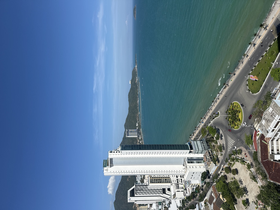 A rotated aerial view reveals a city adjacent to a body of water, possibly an ocean