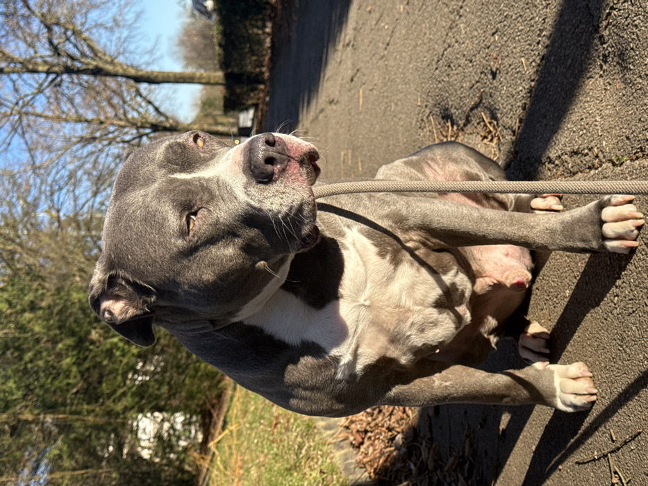 The image displays a grey and white American Bully or Pit Bull-type dog sitting on a paved surface outdoors