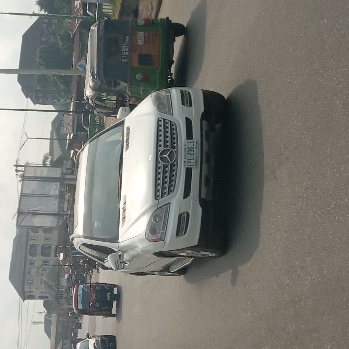 The scene depicts a daytime urban street in Umuode, Nigeria. A white Mercedes-Benz ML-Class SUV is prominently featured in the foreground, positioned slightly right of center and facing towards the viewer at an angle. The vehicle displays a front license plate reading "LAGOS EPE 236 JE," indicating registration in Lagos State, Nigeria. To the left, a red and black motorized tricycle (Keke Napep) is visible in the middle distance, traveling away from the viewer. To the right, a green and black motorized tricycle, marked with "G 6934" on its rear, is observed moving in the same direction, slightly behind the Mercedes-Benz. A person wearing a light-colored, possibly striped, top and dark trousers is visible standing near the right side of the green tricycle. The road surface is asphalt. In the background, various multi-story buildings, some with dark roofs, line the street. Overhead power lines, utility poles, and large billboard structures are visible. A green barrier or fence runs along the right side of the road. Shadows are cast by the vehicles, indicating daylight conditions.