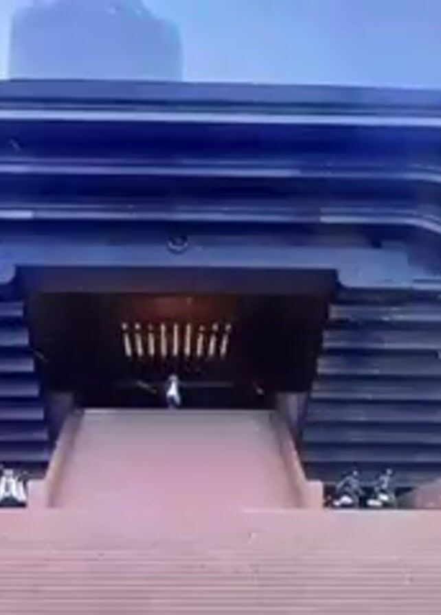 group of dancers wearing black suits, hats, and glasses in front of a large, stylized eye. The eye has a blue center and rings of gold and light around it. The dancers are performing synchronized movements. The scene then shifts to a large building with a tiered, overhanging roof and wide steps leading up to a central entrance. People are visible on the steps and at the entrance. The building appears to be constructed of dark materials. The camera zooms in on the entrance of the building, revealing a figure standing in the doorway, partially obscured by light and possibly a special effect. The figure appears to be human-shaped and luminous.