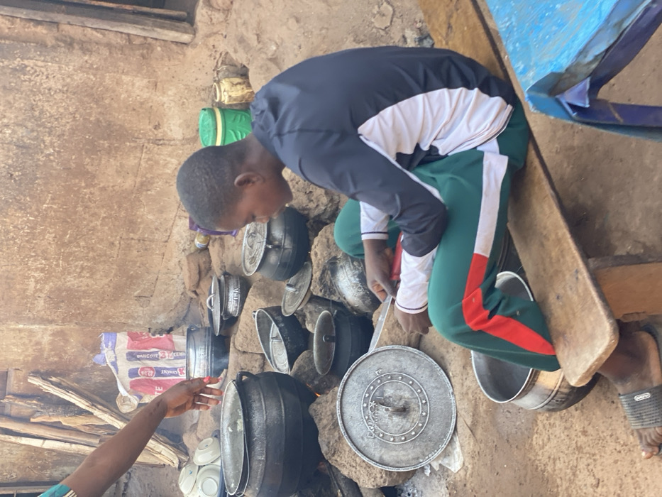 A person kneels beside an earthen wall adorned with cooking pots of varying sizes. The individual wears a black jacket with white sleeves and green pants with a red stripe. They appear to be stirring or preparing food in one of the pots. To the left, another person's arm reaches toward the cooking area near a bag that is leaning against the wall. A blue plastic chair sits partially visible in the upper right corner. The scene gives an impression of daily life around cooking.