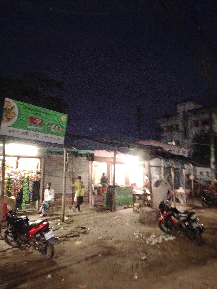 The image depicts a street scene in Bhola, Bangladesh, located at coordinates 22.657 latitude and 90.663 longitude. The scene takes place in the evening, under a dark sky with a few stars visible. The street is lined with shops, and there are two motorbikes parked on the street. Three men are visible in the image: one is standing in front of a shop, another is sitting on a bench, and the third is walking away from the camera. The ground is covered with dirt and debris, and there are some stray pieces of trash scattered throughout. The scene is illuminated by a few streetlights and the lights from the shop windows. The building with the sign is a small store with shelves full of goods and a glass window. The shop is likely selling groceries or other household items. The overall impression is one of everyday life in a small town.