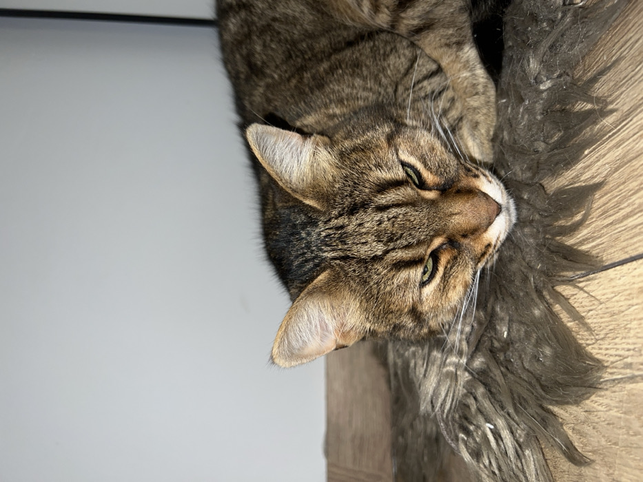 A domestic tabby cat is observed resting indoors, appearing to be in a state of repose