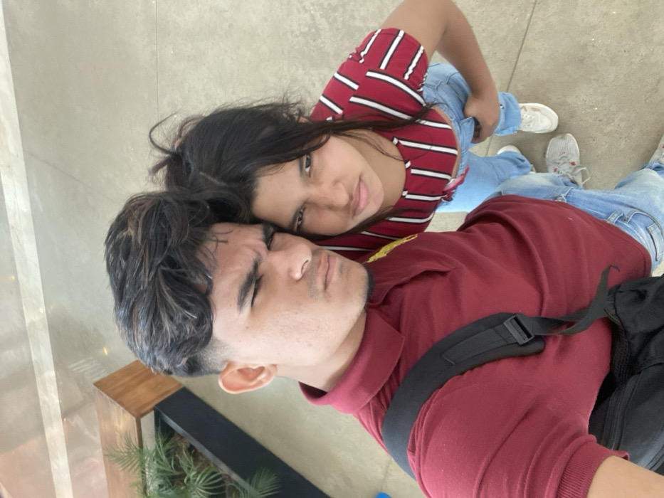 A selfie-style photo shows a young couple. The male, in a maroon polo and black backpack strap, is in the foreground with brown and blonde highlighted hair. Behind him is a young woman wearing a red and white striped shirt with light blue jeans. Both face the camera with serious expressions. Their shoes are visible, and they stand on a light tile floor. The background includes a small planter box with greenery and a reflective surface. The picture is taken from a high angle.