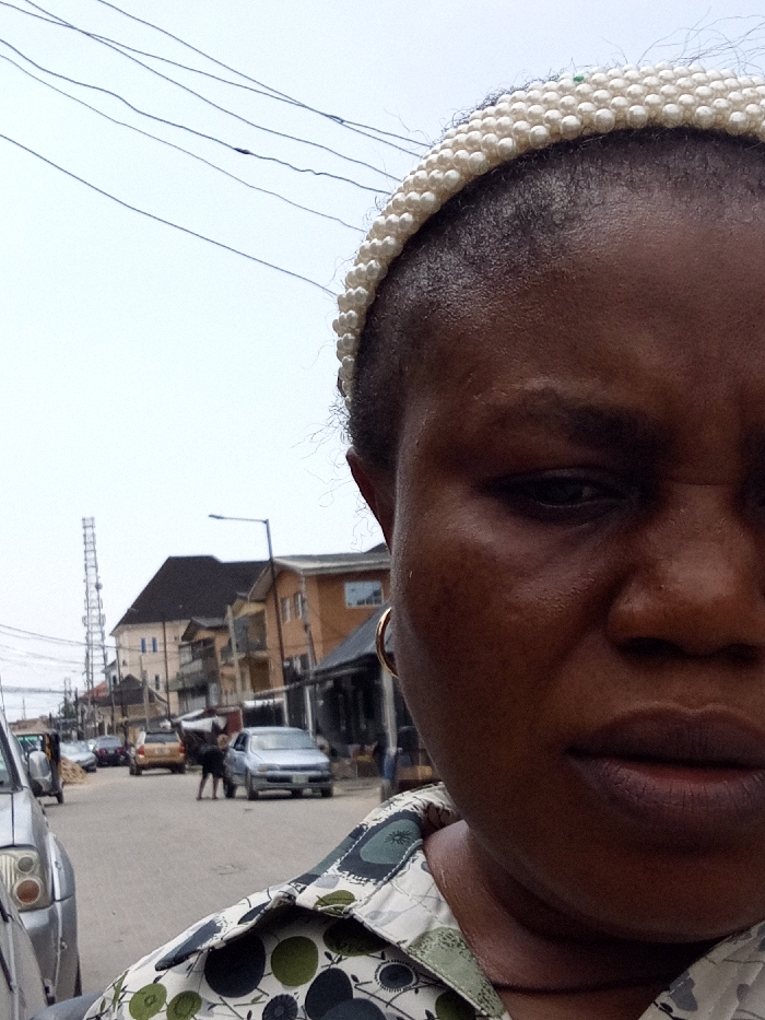 The image depicts an urban street scene in Agani, Nigeria, captured from a slightly elevated perspective. The right half of the frame features a partial close-up of an adult female's face. She has dark skin, her right eye, nose, and mouth area are visible. She wears a white, pearl-studded headband and a gold-colored hoop earring in her right ear. Her attire includes a collared shirt patterned with dark green, black, and light gray shapes on a light background. The background shows a street receding into the distance under an overcast sky. Multiple dark utility wires stretch across the upper portion of the scene. The street is populated with various vehicles, including a silver sedan in the mid-ground, a lighter-colored sedan behind it, and the front quarter panel of a silver vehicle in the immediate left foreground. A tricycle, commonly known as a Keke NAPEP, is also visible on the far left. At least two pedestrians are discernible on the street in the mid-ground, near the silver sedan. Multi-story buildings, some with balconies, line both sides of the street. A tall, lattice-style communication tower and a street lamp are visible on the left side of the street further in the distance. The environment is consistent with a busy urban setting.