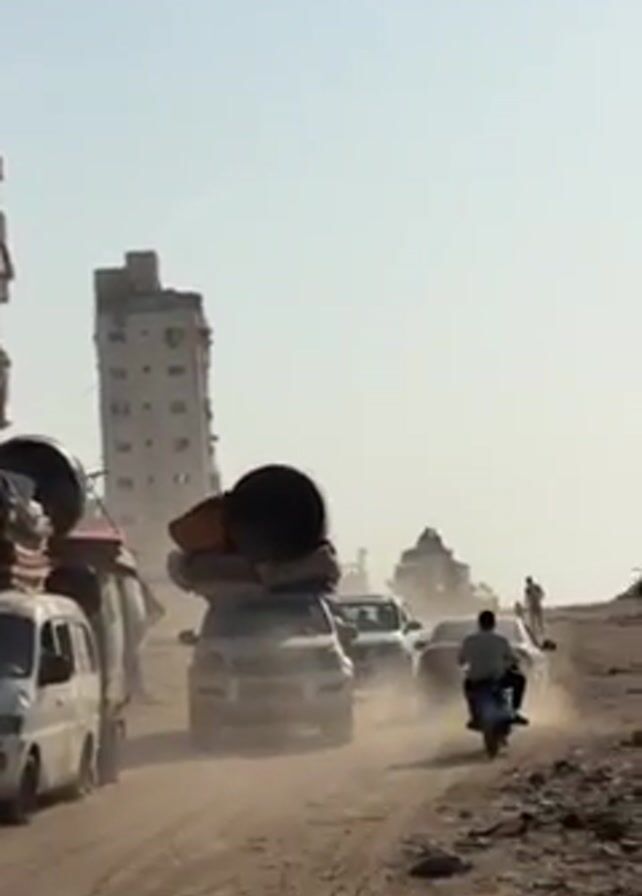 The video depicts a dusty, possibly damaged urban area, with several vehicles, including vans, a Toyota Prado, and a scooter, driving along a dirt road. The vehicles are heavily laden with items stacked on their roofs, obscuring the view of the vehicles themselves. There are buildings on either side of the road that appear worn. Several people are walking in the area. The sky is bright and hazy, contributing to the dusty atmosphere.