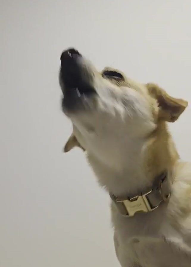 - "A low-angle shot shows a light-colored dog wearing a collar with its name on it, looking up and howling against a plain white background" by FM-Zrr2E2, licensed under CC BY 4.0