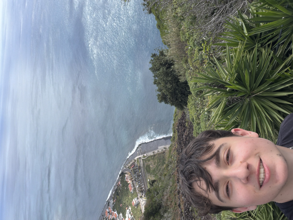 The image displays an elevated coastal view in Calheta, Portugal, with a male subject in the foreground. **Subject (Person):** A male individual, appearing in his late teens or early twenties, occupies the lower-left quadrant of the frame. He has short, dark brown hair and is smiling, looking directly at the camera. He wears a dark shirt. **Foreground Environment:** Immediately behind and to the right of the subject are dense clusters of green, spiky-leaved plants, consistent with Yucca or Agave species. The ground beneath this vegetation is rugged and dark. **Midground Environment:** A steep, verdant hillside descends from the vantage point towards the coastline, featuring scattered darker patches of soil or rock among the green foliage. **Background (Coastal Area, Calheta, Portugal):** At the base of the hill, a coastal town or settlement is visible, characterized by numerous buildings with reddish-brown tiled roofs. A paved road runs parallel to the shore. Adjacent to the road is a dark-colored beach, likely composed of pebbles or black sand, where white-capped waves are breaking. A concrete or stone pier/breakwater extends into the water from the beach. A parking area with parked vehicles is discernible near the coastal road. **Background (Ocean/Sky):** The Atlantic Ocean dominates the upper portion of the image, presenting varying shades of blue and grey. Areas of the water's surface exhibit glinting sunlight. The horizon line between the ocean and an overcast, light blue-grey sky is indistinct.