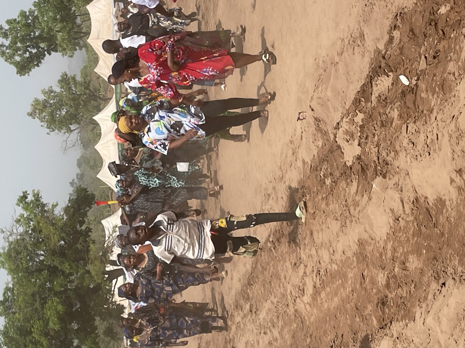 A lively outdoor scene features a group of people gathered on a dusty ground. Several individuals are adorned in vibrant, patterned dresses and shirts. There are also tents in the background. The photo appears to capture a cultural event or celebration, with the attendees possibly dancing or moving together. The attire suggests a festive occasion. The surrounding trees and landscape contribute to the natural setting of the gathering.