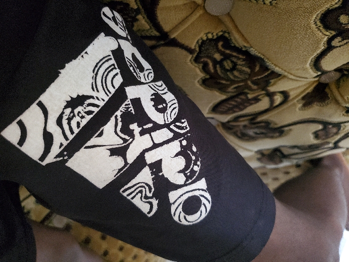 The image depicts an indoor scene in the city of Unknown, Unknown. A dark-skinned individual is seated or reclined on upholstered furniture. The primary subject is the individual's right forearm, covered by a black fabric sleeve or arm warmer. This sleeve displays a large, prominent white graphic design composed of abstract, interlocking shapes, curves, and patterns. The background consists of light brown upholstered material patterned with dark brown floral or leaf motifs and features light-colored circular tufting buttons. Partial views of another dark-skinned limb are visible in the upper right, and a dark-skinned foot in the lower right, both resting against the upholstered surface. No active interactions or additional subjects are present.