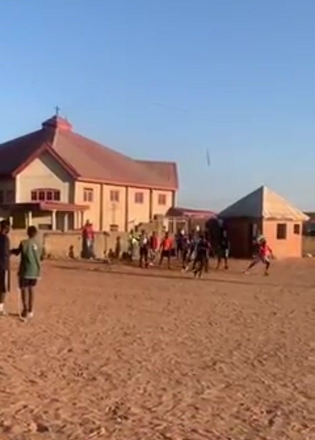 A group of young men is playing soccer on a dirt field under a clear blue sky. There are two men standing on the side of the field. In the background, there is a church, a small shed-like structure, power lines and residential buildings. The soccer players are spread out on the field, some running and kicking the ball.