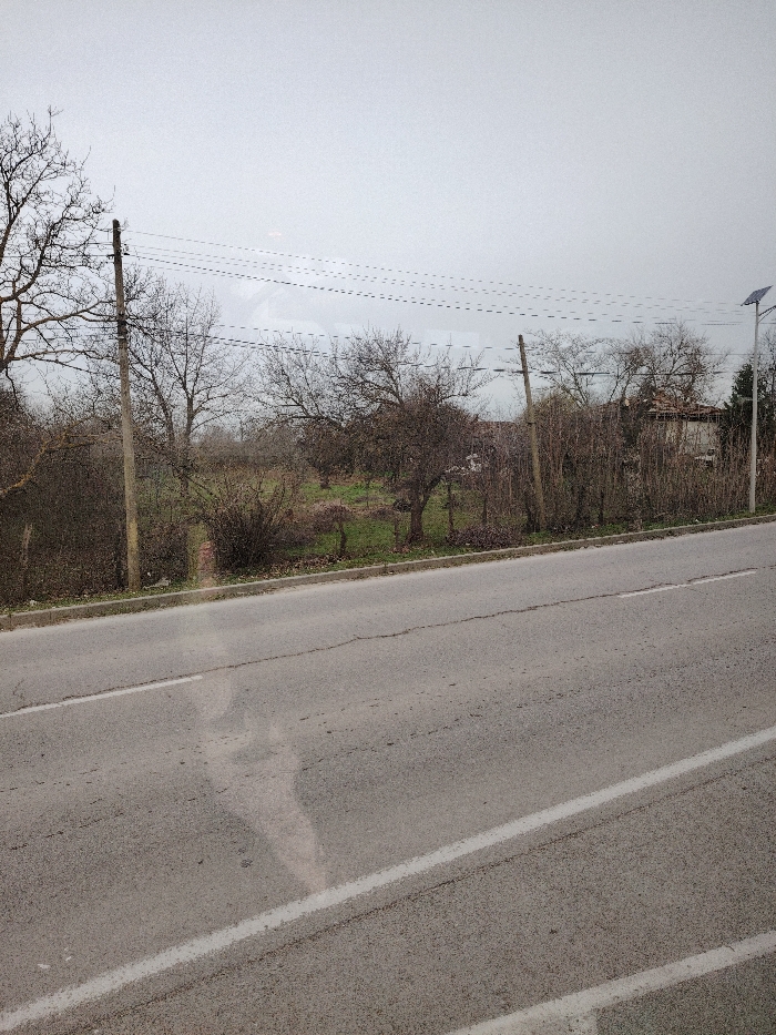 The image depicts an outdoor scene in Alfatar, Bulgaria, under an overcast sky. The foreground is dominated by an asphalt road with visible cracks and two solid white lines, one marking the edge and another approximately mid-lane, with a faint reflection of an interior visible on its surface. Adjacent to the road, on the left, is a narrow dirt and grass verge. Beyond this verge, the midground features a row of deciduous trees and dense shrubs, all bare of leaves, indicating a cold season. Two wooden utility poles, spaced apart, support multiple parallel electrical or communication wires that traverse horizontally across the upper midground. Further back, beyond the initial line of vegetation, a patch of green grass is visible, interspersed with more bare trees. In the background, partially obscured by the trees, a building under construction or renovation, marked by scaffolding, is discernible on the right side. A modern street lamp with a solar panel mounted at its top stands erect on the far right. No individuals or animals are present.