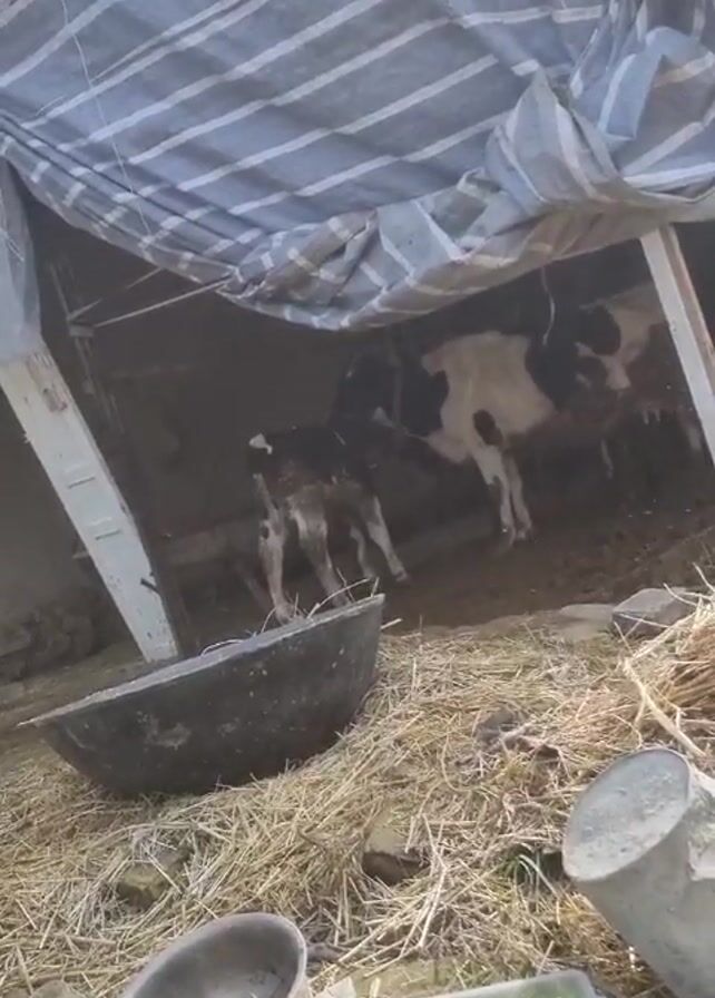cow and a calf inside a makeshift shelter constructed from a striped tarp stretched over a frame. The animals are standing on a dirt floor covered with hay. In the foreground, there are several items including a large, dark-colored bowl, a smaller metal bowl, and a clear plastic container. The light is dim inside the shelter, making the details of the animals slightly obscured. The surrounding area outside the shelter is also covered in hay.
