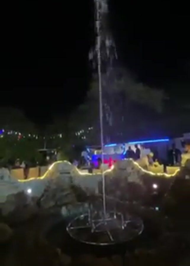 At night, the camera captures a fountain with a single upward jet of water in a courtyard with patrons sitting at tables in the background. The fountain’s basin is surrounded by rocky landscaping with embedded warm white lights. In the background, a building is lit with blue and red lights, where people stand and are seated at tables. The overall impression is of a lively nighttime scene.