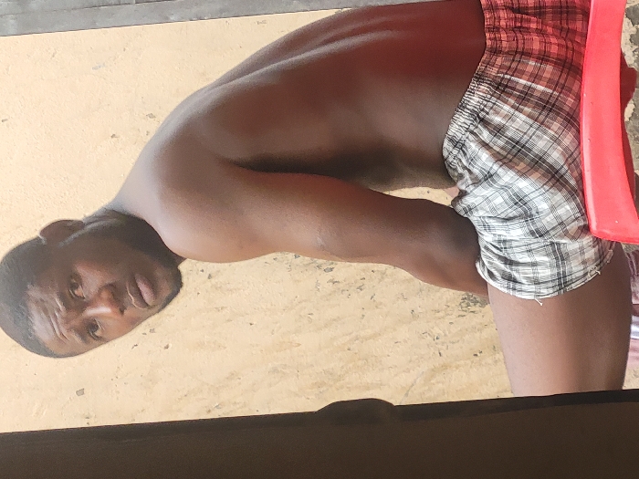 A shirtless, dark-skinned man with a short haircut is pictured from the chest up