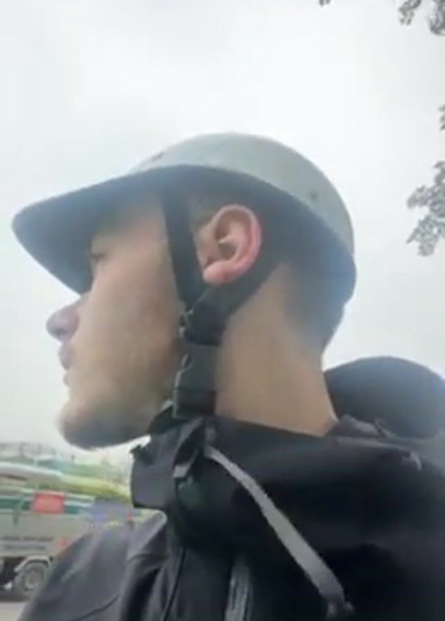 A close-up shot shows a young man wearing a helmet and a black jacket. He has light facial hair. He is looking off-camera to his left, possibly observing something. The background is slightly blurred but appears to be an urban environment with buildings, trees, and some kind of mural or artwork. The sky is overcast. There are sounds of traffic.