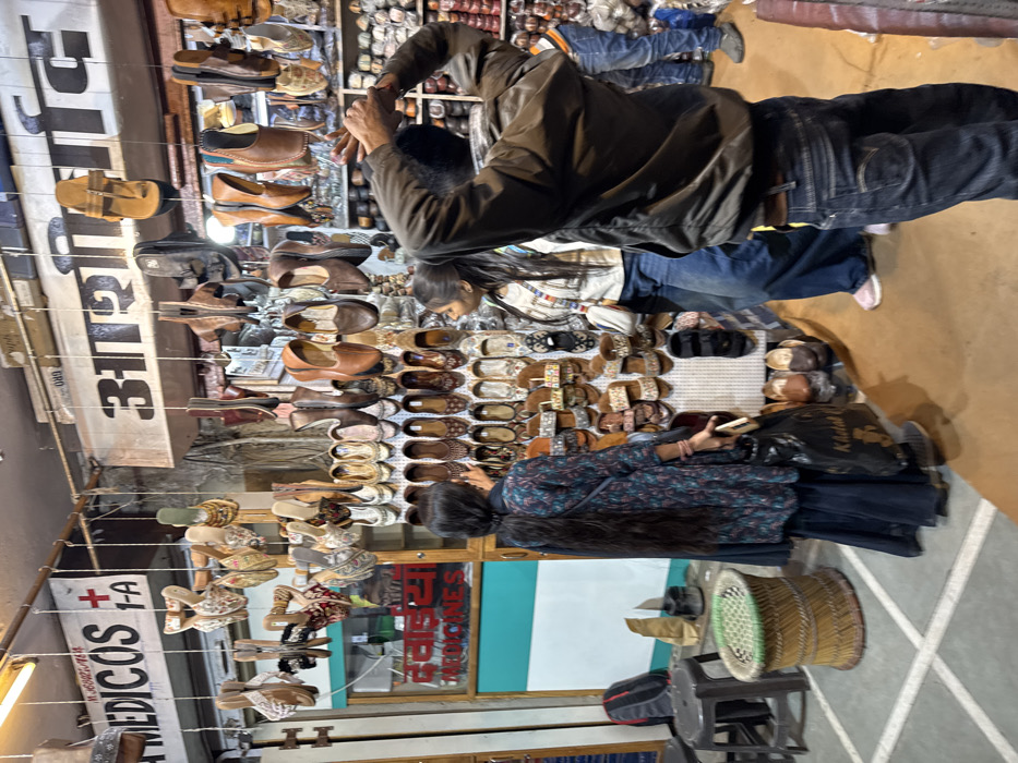 The image depicts a bustling market stall, likely specializing in footwear, located on a street in Jaipur, India