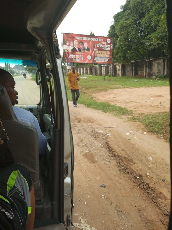 The scene is captured from inside a light-colored vehicle, looking out an open side door towards a dirt path and a main road. In the immediate foreground, the back of a vehicle seat with a black bag featuring a neon green strap is partially visible at the bottom left. The upper torso and head of a male individual in a light blue collared shirt are visible, facing left, suggesting he is either the driver or a front passenger. Outside the vehicle, a dirt path runs parallel. On this path, a male individual is walking away from the camera's left towards the right. He wears a mustard yellow long-sleeved shirt, dark trousers, and white wired earphones. To the right of the dirt path stands a large billboard on metal poles, displaying a red background with white and black text. The text reads "PRAISE CENTRE CHURCH INT'L" and advertises "Cross Over Night" with the tagline "EMPOWERED TO SURVIVE THEM ALL," featuring headshots of multiple individuals. Behind the billboard, a weathered, low concrete wall separates the area from dense green foliage. In the background, beyond the dirt path, a paved road is visible, on which a motorcycle or similar vehicle is moving in the distance. Further beyond, light-colored buildings are visible under an overcast sky. The dense tree line on the right suggests a vegetated environment. Based on the billboard's content, the location is in Owerri, Imo State, Nigeria.