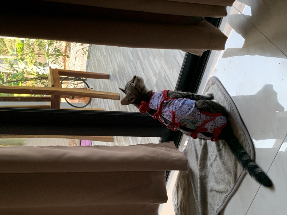 A gray tabby cat wearing a white and light blue patterned shirt with red ties stands on a beige mat next to a window. The cat is looking up and to the left, presumably at something outside. Light enters through the window, illuminating the cat and the surrounding area. Part of the window frame and beige curtains are visible, adding context to the indoor scene. The outdoor background is blurred but suggests greenery.
