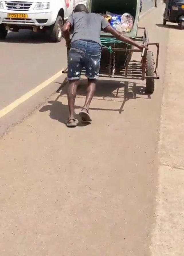 A man is pulling a trash bin on a wheeled frame along the right side of a paved road with a yellow dividing line. The man is Black, wearing a grey t-shirt, denim shorts, and brown sandals. The cart has a green plastic trash bin secured to the frame with rope. The bin contains garbage. He is walking in the same direction as traffic on the right side. Various vehicles including cars, trucks, motorcycles, and auto rickshaws are moving along the road in both directions. There are buildings and trees in the background. The sky is partly cloudy.