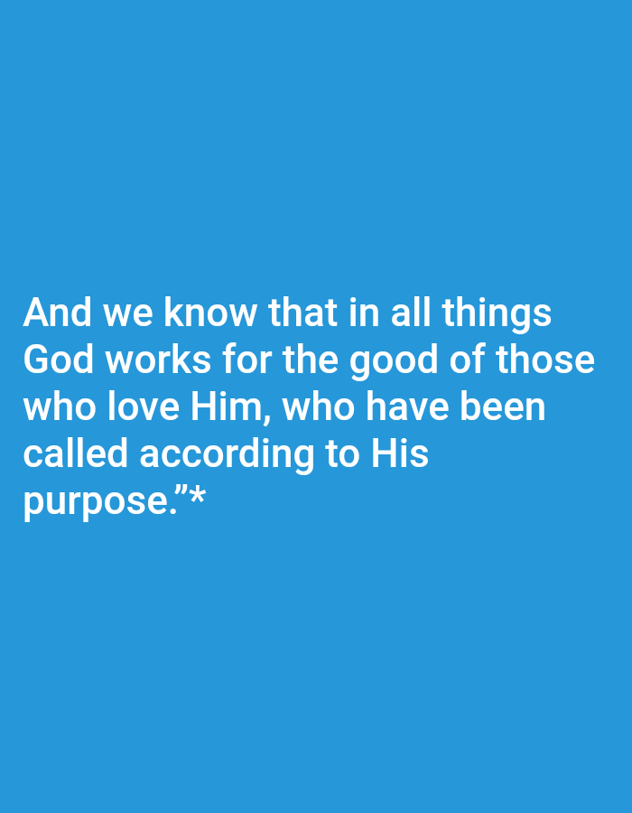 The image displays white sans-serif text centered horizontally against a solid, light blue background. The text reads: "And we know that in all things God works for the good of those who love Him, who have been called according to His purpose."* The bottom line of text terminates with an asterisk. No other subjects, objects, people, actions, interactions, or environmental details are present. The image contains no visual information to suggest a location within the city of Ado-Ekiti, Nigeria, or any other physical setting.