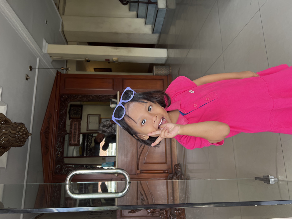 A young girl in a bright pink dress and blue sunglasses poses with a peace sign. She is standing near a glass door with a silver handle. Behind the door is a large wooden structure, possibly a cabinet or entrance feature, with ornate carvings. The background includes a glimpse of stairs and parts of the building's interior. The photograph appears to be taken indoors, with the girl as the focal point, creating a candid and playful scene.