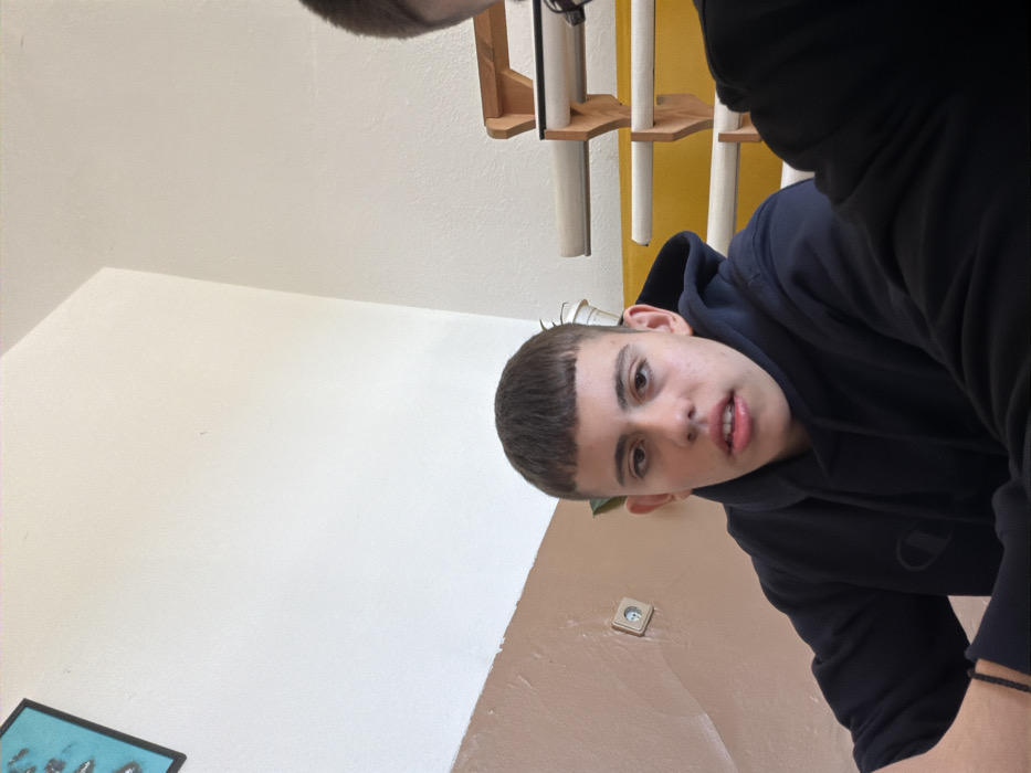 The image captures an indoor scene in Panagyurishte, Bulgaria, featuring a young male subject in the foreground, facing the camera directly