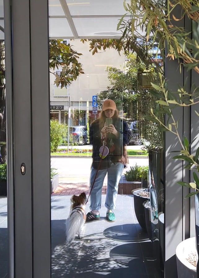 A woman in a baseball cap, jacket, light blue jeans, and green sneakers takes a picture of herself and her dog in the reflection of a glass door. She holds a smartphone in front of her face. The dog, a small breed with long white and brown fur, stands patiently beside her on a leash. The reflection also shows a street scene with cars, buildings, and a crosswalk. A man walks by in the background. The entrance to the building is decorated with potted plants.