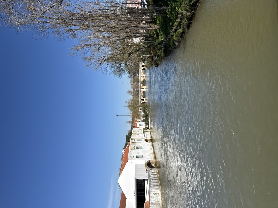 An image depicts a daytime view of the Nabão River in Tomar, Portugal, flowing under a clear blue sky. The river occupies the central and lower portions of the frame, exhibiting murky, greenish-brown water with visible surface ripples indicating a current. On the left bank, a multi-component structure is present. In the foreground, a modern white building with dark rectangular windows and a flat roof is adjoined to an older, traditional white building featuring a terracotta-tiled roof and several arched openings at its base near the water. A concrete embankment borders the river along this side. Further upstream on the left, additional buildings with terracotta roofs are visible. The right bank is densely lined with tall, slender, bare deciduous trees, their branches and trunks prominent. Green undergrowth covers the ground along this bank, and sections of a wooden retaining barrier are visible at the water's edge. In the mid-ground, a historic, light-colored stone bridge with multiple arches spans the river. Beyond the bridge, more distant trees and urban structures are discernible. Two tall, slender utility poles stand on the left, situated between the buildings and the bridge. The sky above is uniformly clear and deep blue, devoid of clouds. No individuals or active human elements are present in the scene.