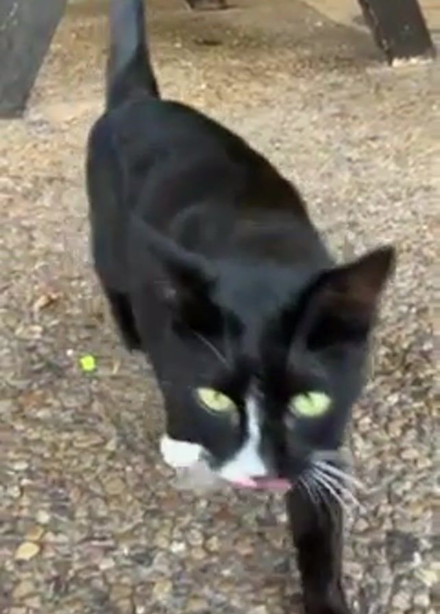 black and white tuxedo cat standing on a gravelly surface. The cat licks its lips, looks at the camera, and then approaches a person. The person reaches down to pet the cat. A table leg is visible in the background.