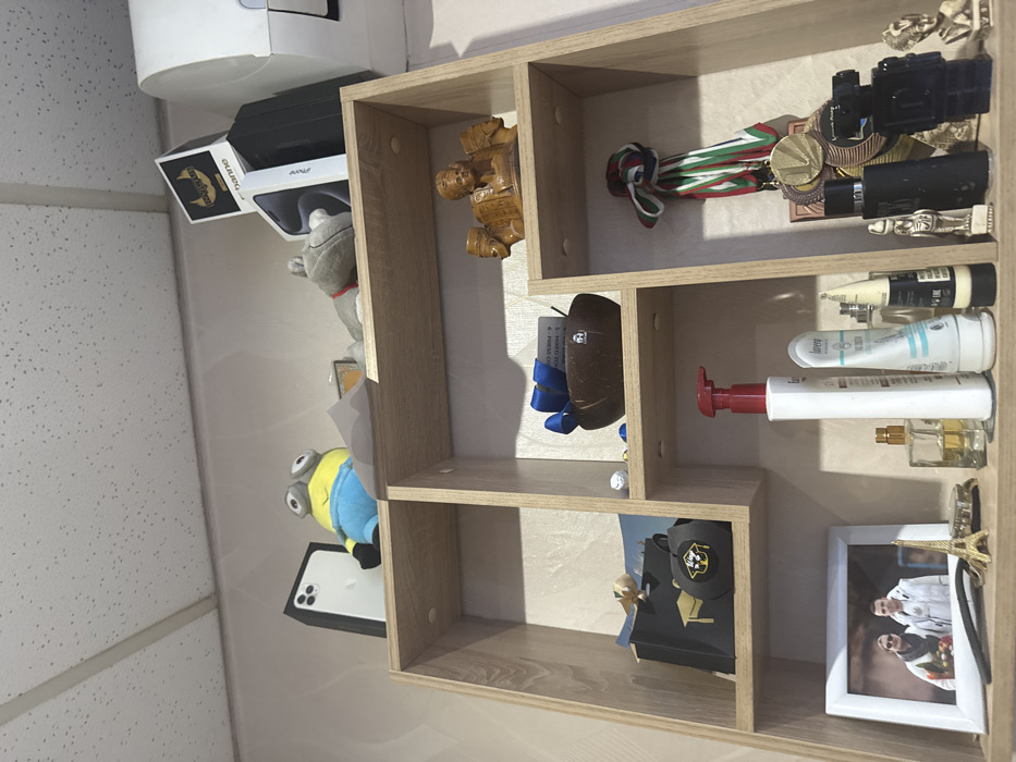 The image displays an interior scene focused on a wall-mounted wooden shelving unit with a light finish. The unit features multiple compartments of varying sizes. Above the unit, a white acoustic tile ceiling is visible, and the wall behind is light-colored. On the top surface of the shelving unit, from left to right, are: a white iPhone 11 Pro box, a yellow Minion plush toy, a grey plush toy, a white box labeled "rabanne," and another white iPhone box. A portion of a white wall-mounted air conditioning unit is visible on the far right. The top shelf row contains: - The leftmost large compartment holds a black gift bag with a golden graduation cap logo and a smaller black cap with a white "G" emblem. - The central compartment displays a coconut shell bowl adorned with blue ribbons and a small white card partially legible as "PRESS CO..." and "SOFIA..." followed by numbers. Several small white and blue spherical objects are also present. - The rightmost compartment features a carved wooden bust, potentially of Egyptian origin, depicting multiple faces or deities. The bottom shelf row contains: - The leftmost large compartment holds a white-framed photograph depicting two young males, one holding a bouquet, dressed in winter attire. A miniature golden Eiffel Tower figurine and a dark, slender object are positioned in front of the frame. - The central compartment contains a tall white Eucerin bottle with a red pump, a smaller white Eucerin tube, multiple clear glass perfume bottles, and a cosmetic tube with a black cap. - The rightmost compartment displays a set of medals suspended by ribbons in red, white, and green, consistent with the Bulgarian flag. Several men's perfume bottles are also present, including a black rectangular bottle and a blue robot-shaped bottle. Two small figurines, one resembling an Egyptian pharaoh, stand among the bottles. The "SOFIA" text on the card in the central top compartment indicates the location is within the city of Sofia, Bulgaria.