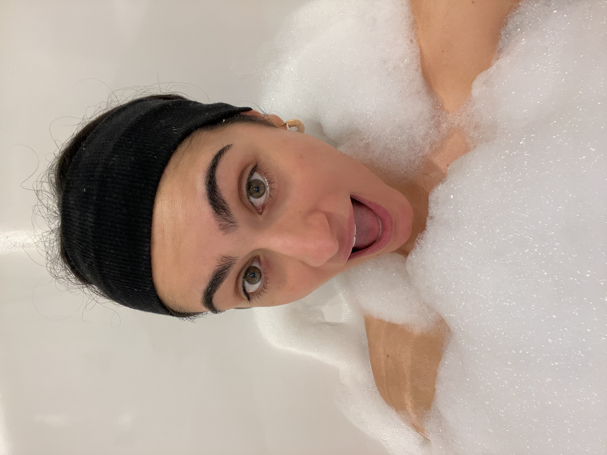 - "A young woman with fair skin, dark eyebrows, and hazel eyes, wearing a black headband, is partially submerged in a white bathtub filled with bubbly foam" by FM-t80Kg1, licensed under CC BY 4.0