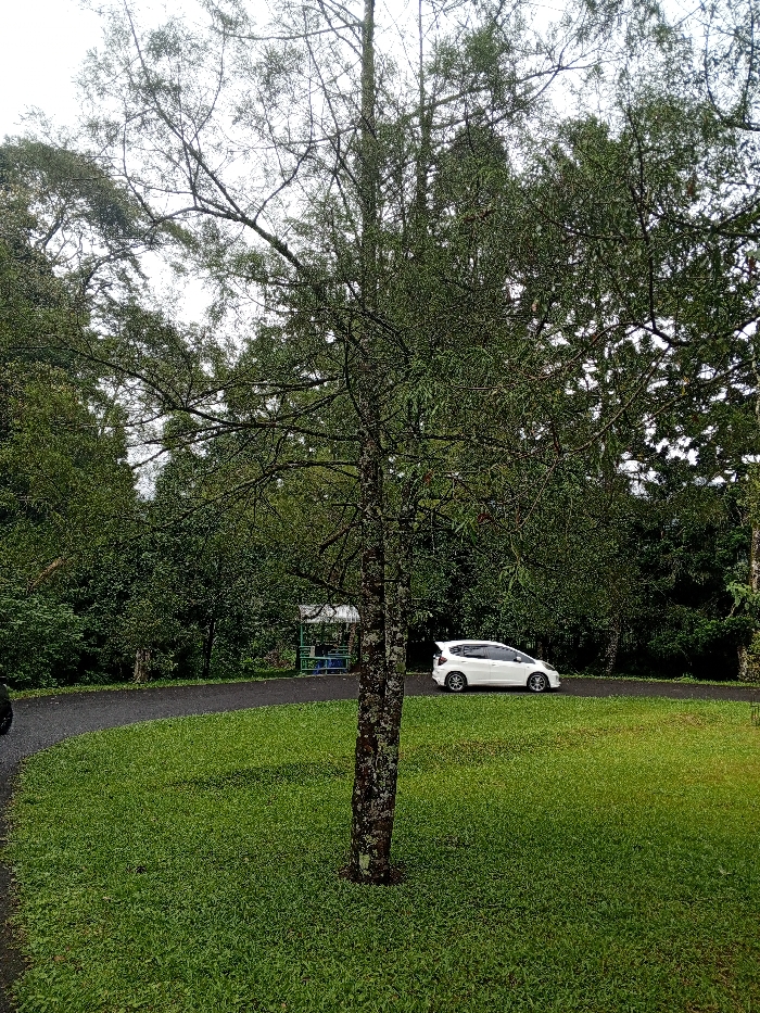 A single, slender tree stands prominently in a green, grassy area bordering a curved, black asphalt road. Beyond the road, dense, green trees form a backdrop, partially obscuring a small, white car parked nearby. A small, light-colored structure is also visible through the trees in the background. The sky overhead is overcast, creating a soft, diffused light.