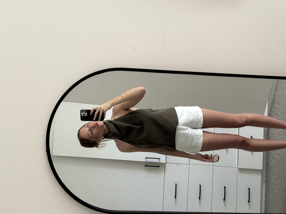 A woman is reflected in an oval mirror, taking a selfie. She wears a dark, sleeveless top and white shorts. Her phone is in her left hand, and she holds sunglasses in her right. Behind her in the reflection are white cabinets with black hardware. To the side of the mirror is a plain white wall. The floor is carpeted. The image is rotated counter-clockwise.