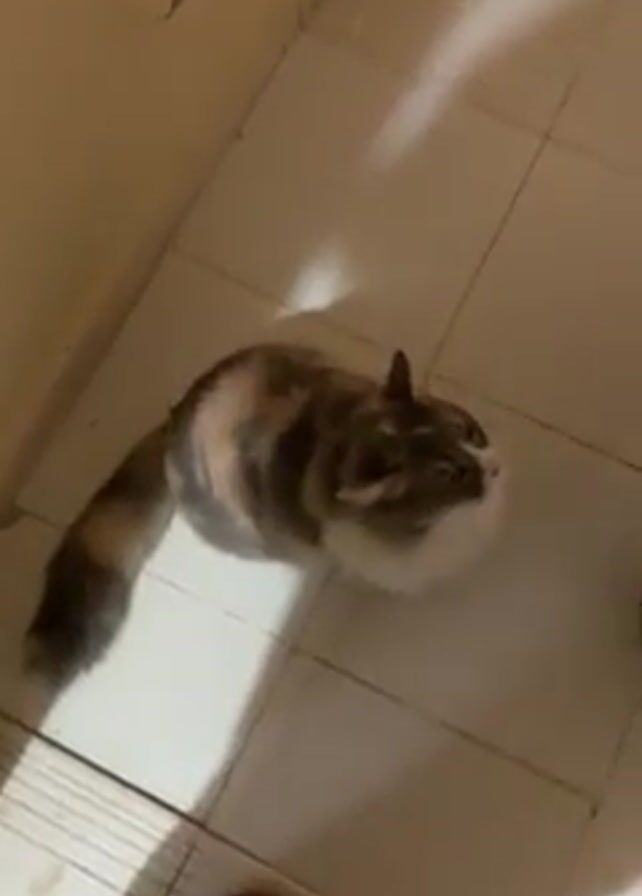 A person pets a calico cat standing on a floor tiled with square off-white tiles