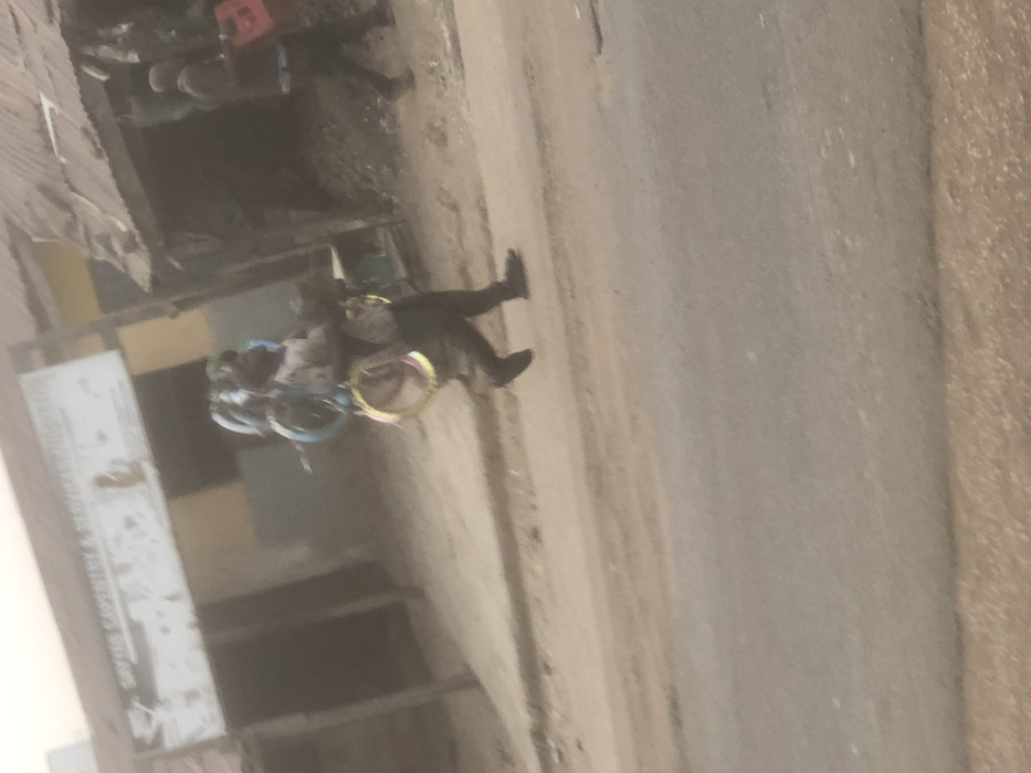 A man is standing beside a street, possibly selling items. He's holding a collection of colorful rings or toys. He's dressed in dark clothes. The background shows a building with signage and what appears to be a vehicle parked on the other side of the road. The scene is captured at an angle, making it appear tilted.