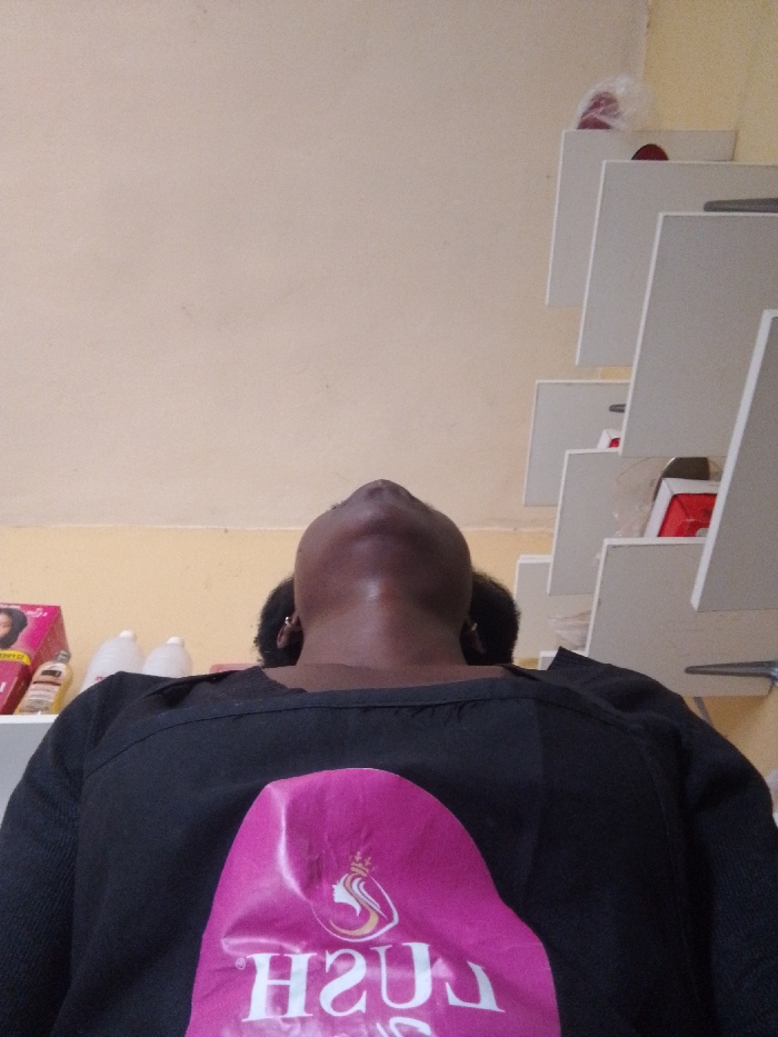 In the City of Unknown, Unknown, an indoor scene is depicted from a low-angle perspective, looking upwards. A dark-skinned individual occupies the lower-center frame, observed from the mid-torso to the upper head. Their head is tilted significantly backward, exposing the underside of the chin and neck. Small, silver-colored hoop earrings are visible in both ears, with dark, pulled-back hair on either side of the head. The individual wears a black garment, likely a smock or apron, featuring a prominent, large, bright pink patch on the chest. This patch displays a white logo comprising a stylized crown above a woman's profile, and the word "LUSH" printed horizontally reversed (appearing as "HSUL"). The background consists primarily of a plain, light beige or pale yellow wall. To the lower left, a portion of a white shelf or counter is visible, holding a pink box with an image of a woman's face and text (partially obscured, possibly "LUSTRE HAIR"), alongside two opaque white bottles. To the right, a multi-tiered, white shelving unit with at least five staggered shelves is mounted on the wall. The topmost shelf holds a red object, possibly contained within a clear plastic bag. Other shelves contain indistinct objects, including red and white items. A silver-colored fixture is visible on the far right, near the bottom of the shelving unit. The environment suggests a salon or personal care setting.