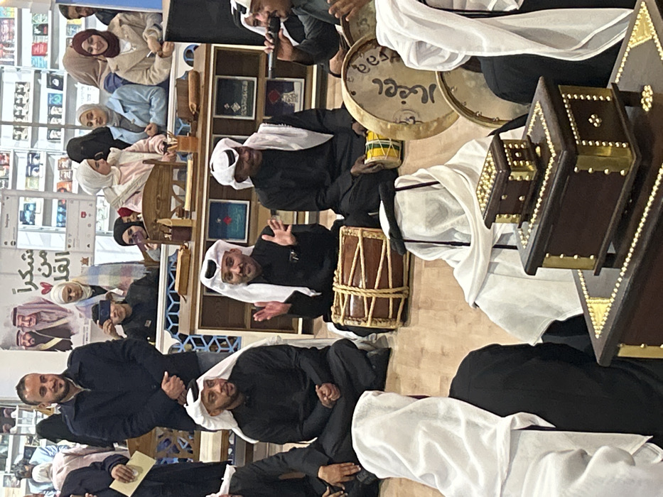 A group of men are gathered indoors, some seated on the floor. The men are wearing traditional clothing, including white headdresses and dark robes. Two men are playing percussion instruments, including a drum with intricate designs. Some people in the background appear to be watching the performance, and there are shelves with books behind them. One man gestures with his hands while another sings into a microphone.