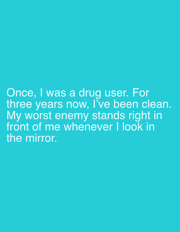 This digital image, originating from Marousi, Greece, features white sans-serif text centered on a solid teal background. The background color is a uniform, medium-saturation cyan-blue. The text reads: "Once, I was a drug user. For three years now, I've been clean. My worst enemy stands right in front of me whenever I look in the mirror." No discernible people, objects, actions, or specific physical environment of Marousi are depicted within the image content. The image is an abstract composition of text on a colored field.