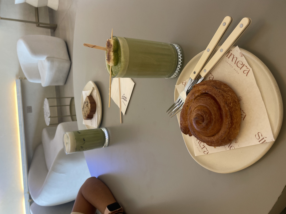 An overhead shot reveals a table arrangement. A croissant rests on a plate with cutlery. Nearby, two cylindrical glasses contain green drinks, one garnished with toasted marshmallows on skewers. A small plate holds a slice of cake, and a napkin with text is positioned between the glasses. A person's legs, adorned with a watch, are visible in the lower part of the frame, positioned near an interior design featuring white curved chairs.