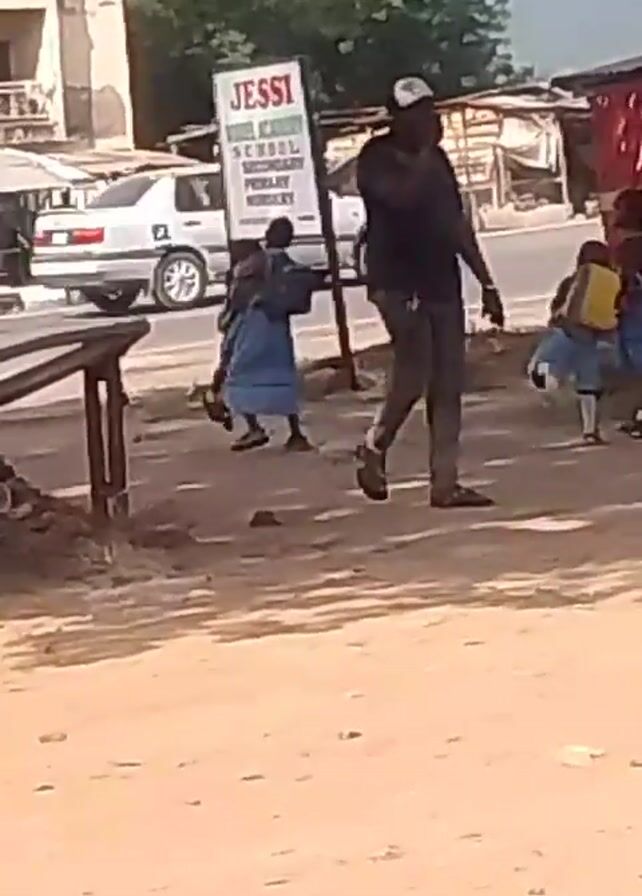 The scene depicts a roadside area, with a dirt foreground and a paved road in the background. A man wearing a cap and casual clothing stands near the edge of the road, appearing to be talking or holding something to his ear. Several children in school uniforms, some carrying backpacks, are walking or running near him. A sign for "JESSI MODEL ACADEMY" is visible in the background. There are also structures that appear to be small shops or stalls and a motorcycle. The scene seems to be set in a rural or suburban environment.